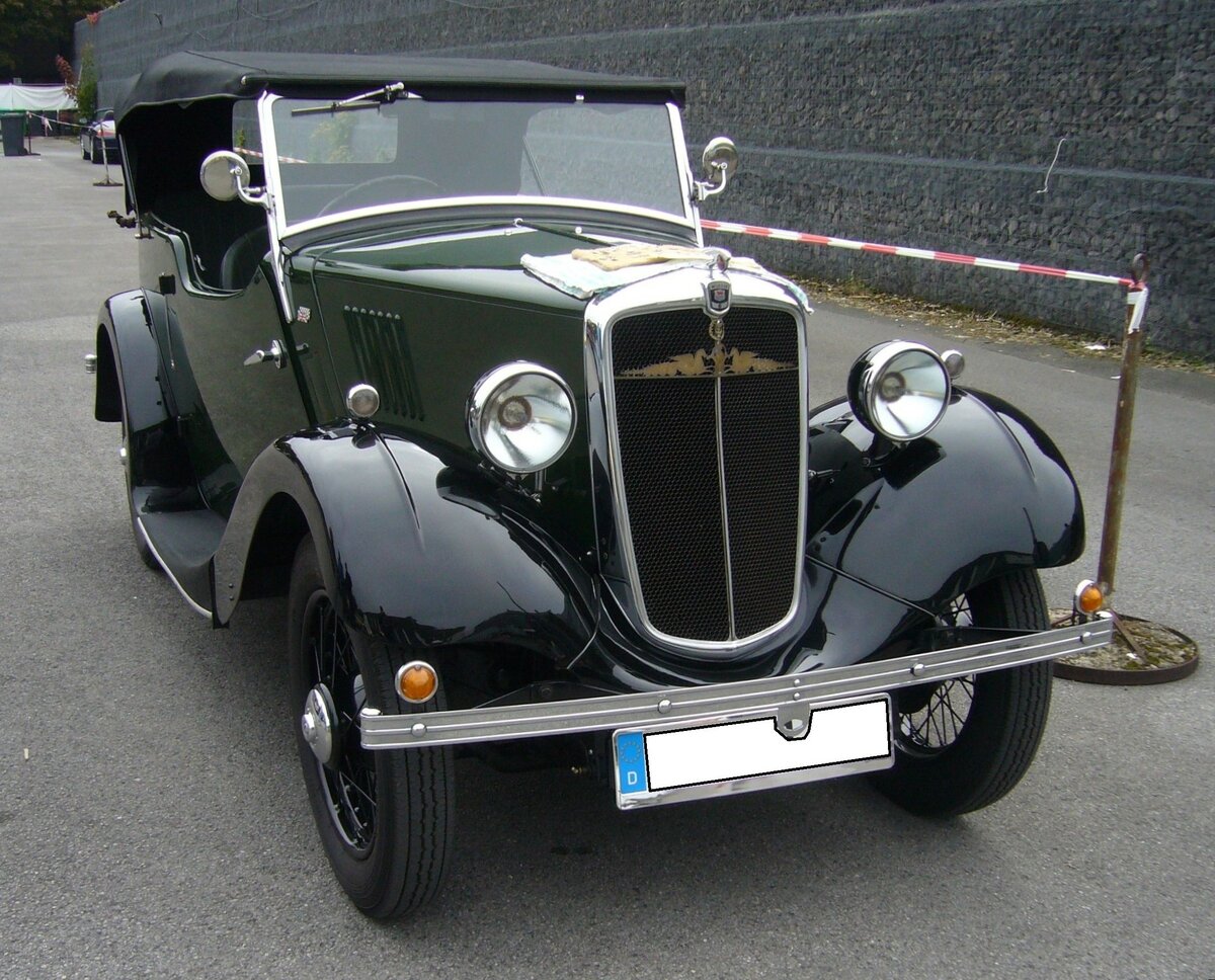 Morris Eight MK1 Tourenwagen aus dem Modelljahr 1936. Gebaut wurde das Modell von 1935 bis 1952 in etlichen Karosserieversionen. Der "Eight" war als Konkurrenz zum, in Großbritanien sehr erfolgreichen Ford Model Y, entwickelt worden. Die MK1 Modelle wurden 1937 durch den optisch modifizierten MK2 abgelöst. Der Vierzylinderreihenmotor leistet 23 PS aus einem Hubraum von 916 cm³. Oldtimer- und Youngtimertreffen an Mo´s Bikertreff in Krefeld am 08.10.2023.