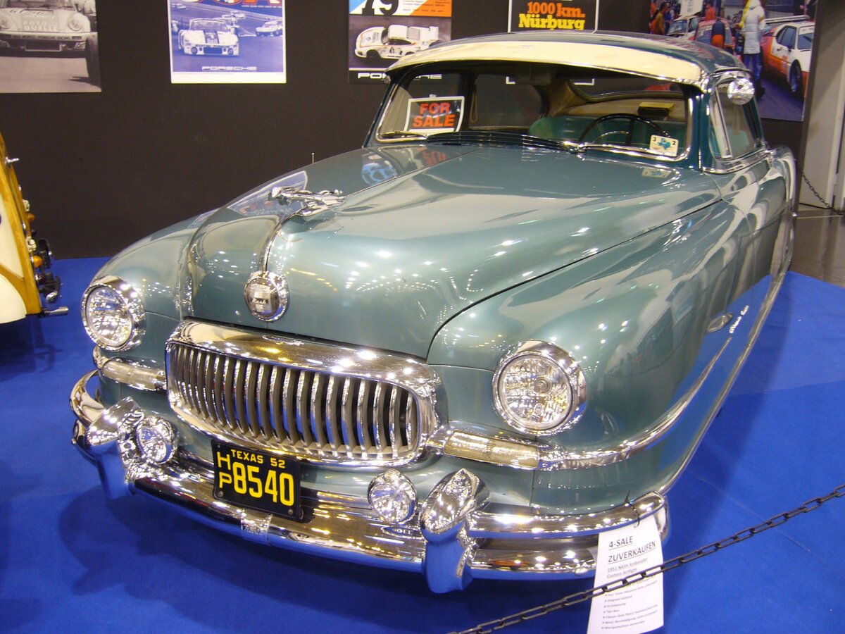 Nash Series 60 Ambassador Custom Airflight aus dem Jahr 1951 im Farbton meadow green. Im Modelljahr 1951 waren die Series 60 Ambassador-Modelle die mittlere Variante im Programm der Nash-Motors aus Kenosha/Wisconsin. Darunter rangierten die Series 40 Statesman-Modelle und darüber die Series 10 Nash-Rambler Fahrzeuge. Von diesem "Custom Airflight" wurden in diesem Modelljahr lediglich 37 Fahrzeuge produziert. Der Sechszylinderreihenmotor hat einen Hubraum von 3013 cm³ und leistet 82 PS. Essen Motor Show am 06.12.2022.