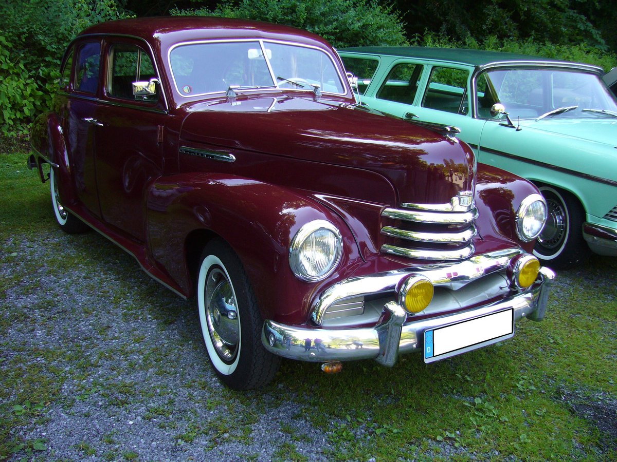 Opel Kapitän, gebaut von 1951 bis 1953. Dieses Kapitänmodell basierte auf dem Vorkriegskapitän, der ab 1948 wieder bei den Händlern stand. 1951 bekam er ein "Facelift". Dieses war an die zeitgenössischen Chevrolet-Modelle des Mutterkonzernes GM angelehnt. Angetrieben wird der Kapitän von einem Sechszylinderreihenmotor, der aus einem Hubraum von 2473 cm³ 58 PS leistet. Oldtimertreffen "Schwarzwaldhaus" in Mettmann am 09.06.2019.