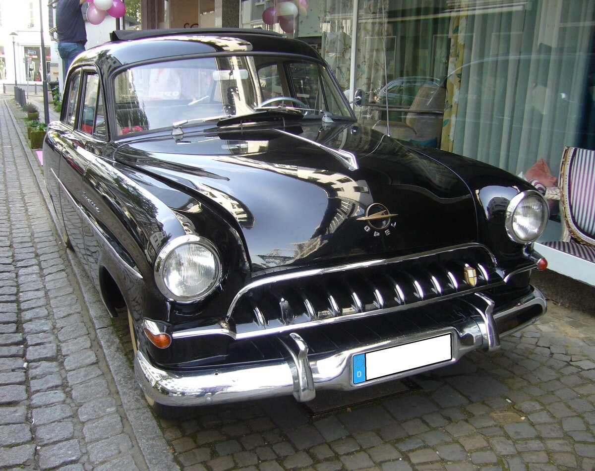Opel Kapitän der Modelljahre 1954 und 1955. Von diesem Modell verkaufte Opel in der zweijährigen Produktionszeit genau 61.543 Fahrzeuge zu einem Preis von mindestens DM 9.660,00. Der Sechszylinderreihenmotor dieses Oberklassenmodells leistet aus einem Hubraum von 2473 cm³ 71 PS. 16. Oldtimertreffen des ACK am 01.05.2024 in Essen-Kettwig.