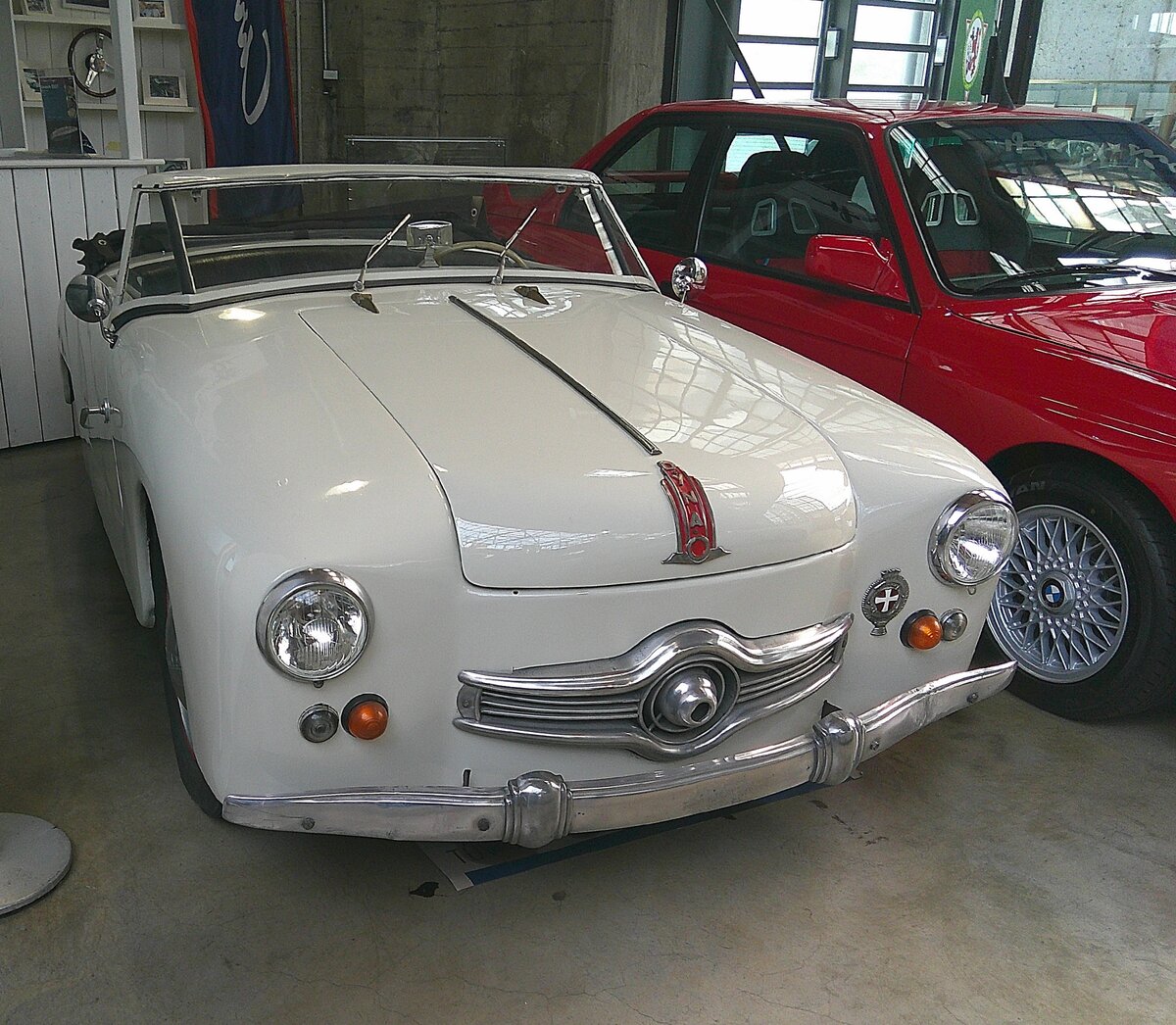 Panhard Dyna Junior X. In der unmittelbaren Nachkriegszeit gab es überall in Europa, also auch in Frankreich, Materialbeschränkungen. Dies war in allen Industriezweigen bis weit in die 1950`er Jahre spürbar. Während einige Hersteller der Automobilindustrie bei der Materialbelieferung Vorrang hatten, wie beispielsweise Renault, das mit seinem 4CV als erster Hersteller voll einsatzfähig war, mussten andere Hersteller warten und meist ihre überarbeiteten Vorkriegsfahrzeuge anbieten. In dieser tristen Automobillandschaft stach Panhard mit seinem Dyna X in seinem unverwechselbaren Stil und der Aluminiumkarosserie hervor. Von 1951 bis 1956 wurde auf dieser Basis ein hübscher, kleiner Roadster, der gezeigte Dyna Junior, gebaut. Ab 1954 wurde der vom Dyna X übernommene Kühlergrill mit der Kugel in der Mitte verbaut. In diesem Jahr wird die Version mit den vier Stuer-PS (4CV) eingestellt, so das nur noch das Cabrio im Handel bleibt. Der Zweizylinderboxermotor hat einen Hubraum von 851 cm³ und leistet 42 PS. Darüber hinaus kann das Modell mit einem MAG-Kompressor geordert werden. Mit dieser Option erhöht sich die Leistung auf 60 PS. Diese Motorleistung ist gut für eine Höchstgeschwindigkeit von rund 145 km/h. Classic Remise Düsseldorf am 26.08.2025.