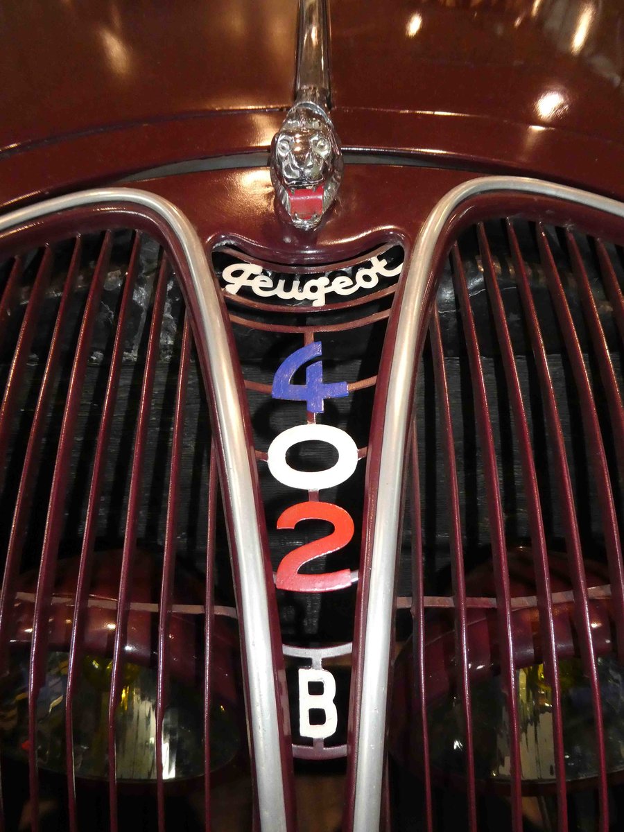 =Peugeot 402 B-Frontemblem, ausgestellt bei den Retro Classics in Stuttgart, 03-2019