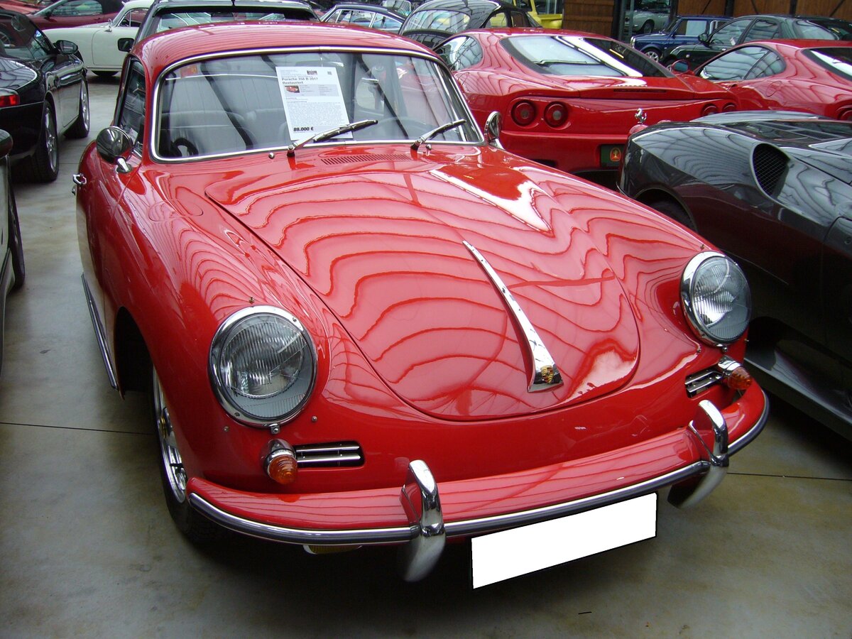 Porsche 356B 1600 Super 75 Coupe im Farbton rubinrot. Das abgelichtete Coupe stammt aus dem Modelljahr 1962. Der luftgekühlte Vierzylinderboxermotor hat einen Hubraum von 1582 cm³ und leistet 75 PS. Das Porsche-Werk gab die Höchstgeschwindigkeit damals mit 175 km/h und den Verbrauch mit 8,2 Litern Kraftstoff auf 100 Kilometern an. Classic Remise Düsseldorf am 15.10.2022.