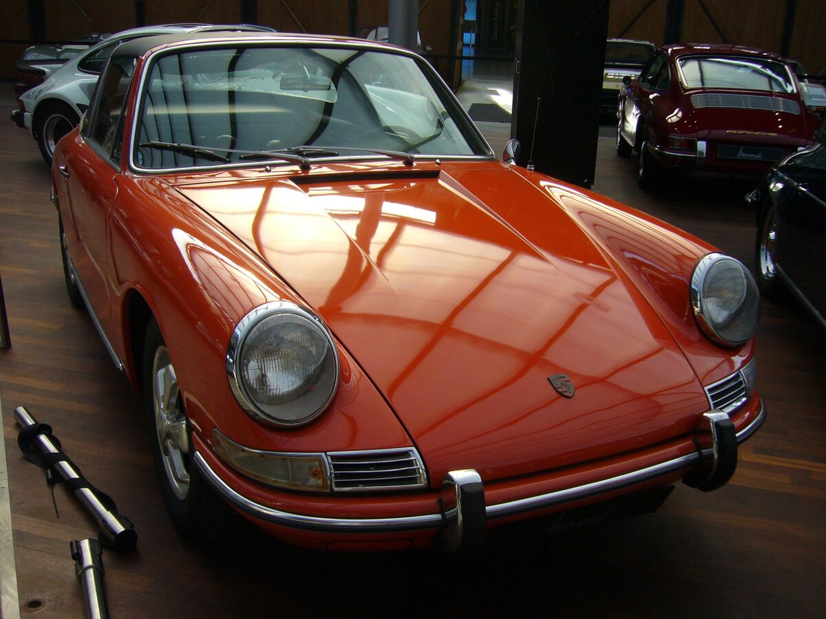 Porsche 911 Targa aus dem Modelljahr 1967. In diesem Modelljahr wurden nur lediglich zehn Autos dieses Types im Farbton R2002 mandarinorange ausgeliefert. Der im Heck verbaute, gebläsegekühlte Vierzylinderboxermotor hat einen Hubraum 1998 cm³ und leistet 130 PS. Classic Remise Düsseldorf am 28.09.2021.