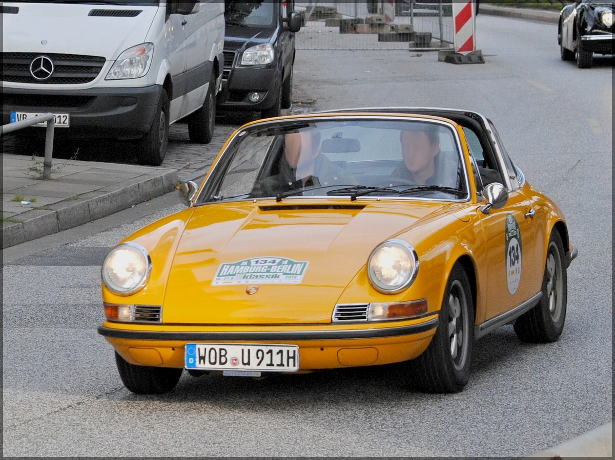 Porsche 911 T Targa, Bj 1972, 2341 ccm, 130 Ps, mit der Startnummer 134 bei der 6.Hamburg Berlin Classic, aufgenommen in Hamburg am 21.09.2013.