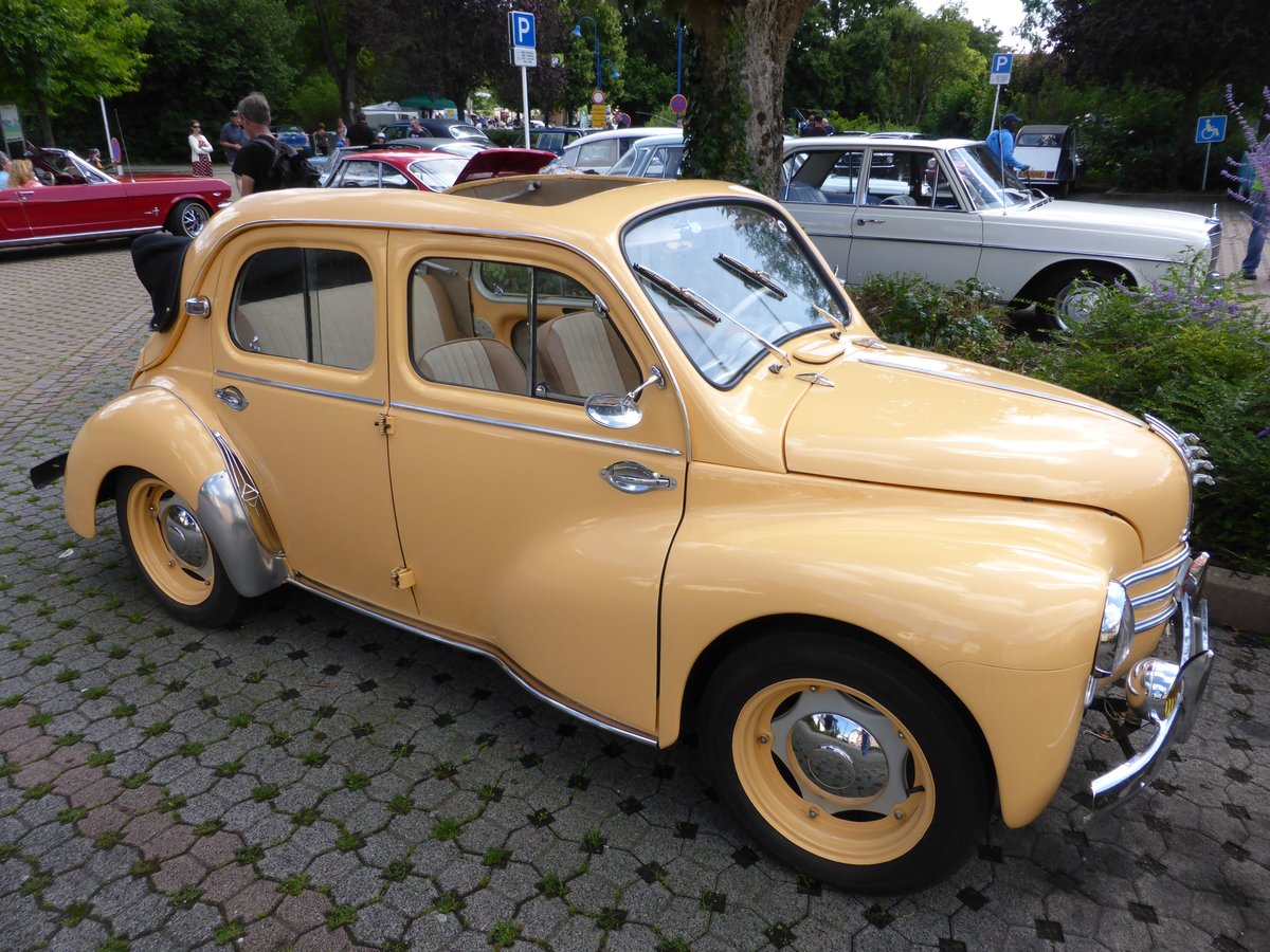 Renault 4CV aus dem Jahr 1959. Produziert wurde dieses Modell in den Jahren von 1946 bis 1961. Der 4CV wurde heimlich während der deutschen Besetzung des Werkes Billancourt im WW2 konstruiert. Während seiner 15-jährigen Produktionszeit wurde der "Motte de Beurre" neben der 2CV von Citroen zum französischen "Volkswagen". Der Vierzylinderreihenmotor mit einem Hubraum von 747 cm³ leistete zwischen 17 PS und 26 PS. Das der hier gezeigte 4CV ein Modell nach 1957 ist, erkennt man daran, dass er nicht mehr mit den charakteristischen Sternfelgen ausgerüstet ist. French Car Devotion an Mo´s Bikertreff in Krefeld am 04.06.2023. Michael H.