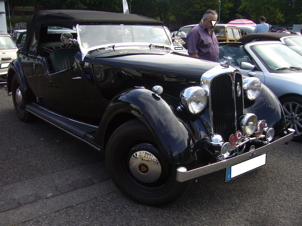 Rover Twelve Sports Tourer aus dem Jahr 1947. Rover Twelve Sports Tourer aus dem Jahr 1947. Dieses Modell kam bereits 1935 auf den Markt und wurde, bedingt durch WW2, 1940 eingestellt. Die Baureihe war damals als viertürige Limousine, viertüriger Phaeton, offener Tourenwagen und eben als Sports Tourer (Foto) lieferbar. Ende 1945 nahm Rover die Produktion ihrer PKW-Modelle wieder auf. Einziger, großer Unterschied zum Vorkriegsmodell, war der nun angesetzte Kofferraum am Fahrzeugheck. Der Vierzylinderreihenmotor hat einen Hubraum von 1496 cm³ und leistet rund 48 PS. British Car and Motorcycle Meeting am 20.07.2025 an Mo´s Bikertreff in Krefeld.
