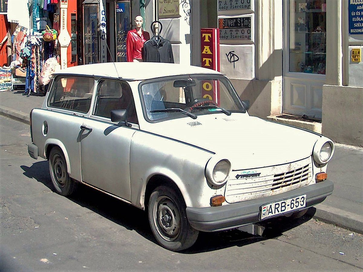 Trabant 1.1 Universal, klassischer 3-Türer-Kombi (mit Plastik-Stoßstange). Aufgenommen im Juni 2004 in Györ, Ungarn