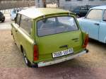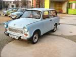 Sachsenring Trabant 601 Universal. Die Baureihe Trabant 601 wurde 1958 als Nachfolger des AWZ P-70 gebaut. Ab 1964 war daraus der Trabant 601 geworden, dem ein Jahr später der das Kombimodell Trabant 601 Universal folgte. Ein solcher 601 Universal kostete bei seinem Erscheinen Ostmark 8900,00. Um sich Devisen zu beschaffen, wurde das Modell auch mit mäßigen Verkaufserfolgen in der Bundesrepublik Deutschland angeboten. Im Jahr 1967 war ein solches Kombimodell für DM 3810,00 zu bekommen. Der Zweizylinderzweitaktmotor hat einen Hubraum von 594,5 cm³ und leistet 26 PS. Oldtimertreffen am Theater an der Niebu(h)rg am 19.10.2025 in Oberhausen/Rheinland.