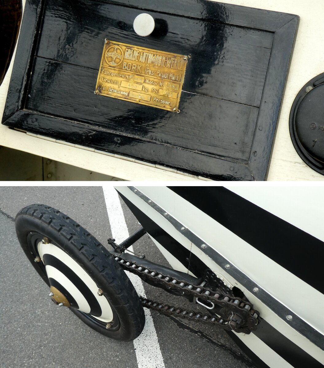 Details eines Fahrzeugs der Grade Automobil-Werke von 1921. Im Februar 1921 wurde die Grade-Automobil-Werke AG vom Flugzeugkonstrukteur Hans Grade zur Herstellung von Kleinwagen gegründet. Die Bestimmungen des Versailler Vertrags untersagten nach dem Ersten Weltkrieg weitgehend die Flugzeugbau-Aktivitäten in Deutschland, so dass sich viele Flugzeugbauer auf benachbarte Gebiete wie den Fahrzeugbau begaben. (Quelle: https://de.wikipedia.org/wiki/Grade-Automobil-Werke). Das originale Typenschild ist hier am Armaturenbrett befestigt. Dieses Fahrzeug fuhr im Jahre 1923 bei einem Rennen auf der AVUS in Berlin. Zu damaliger Zeit üblich: der Antrieb der Hinterachse über eine entsprechend dimensionierte Kette. Foto: AVUS 100, 24.09.2021