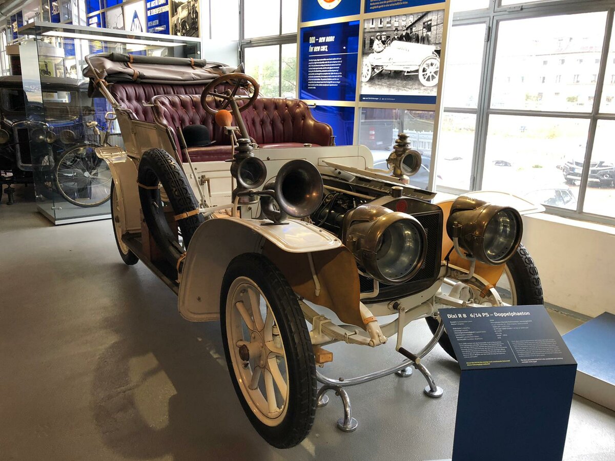 Dixi R8 6/14 PS aus dem Jahr 1910. Im Jahr 1898 begann man in Eisenach mit der Produktion mit der Herstellung von Automobilen. Der hier gezeigte Dixi R8 6/14 PS war das siebte Modell der Marke. Dieses Modell wurde von 1908 bis zum Beginn von WW1 produziert. Angetrieben wird der Wagen, der einen so genannten Doppelphaeton-Aufbau trägt, von einem Vierzylinderreihenmotor in Blockbauweise. Dieser Motor hat einen Hubraum von 1588 cm³ und leistet entsprechend der Typenbezeichnung 14 PS. Dieses Leistung reichte für eine Höchstgeschwindigkeit von 65 km/h. Angeblich soll ein solches Fahrzeug ca. 4900,00 Goldmark gekostet haben. Automobile Welt Eisenach am 14.10.2021.