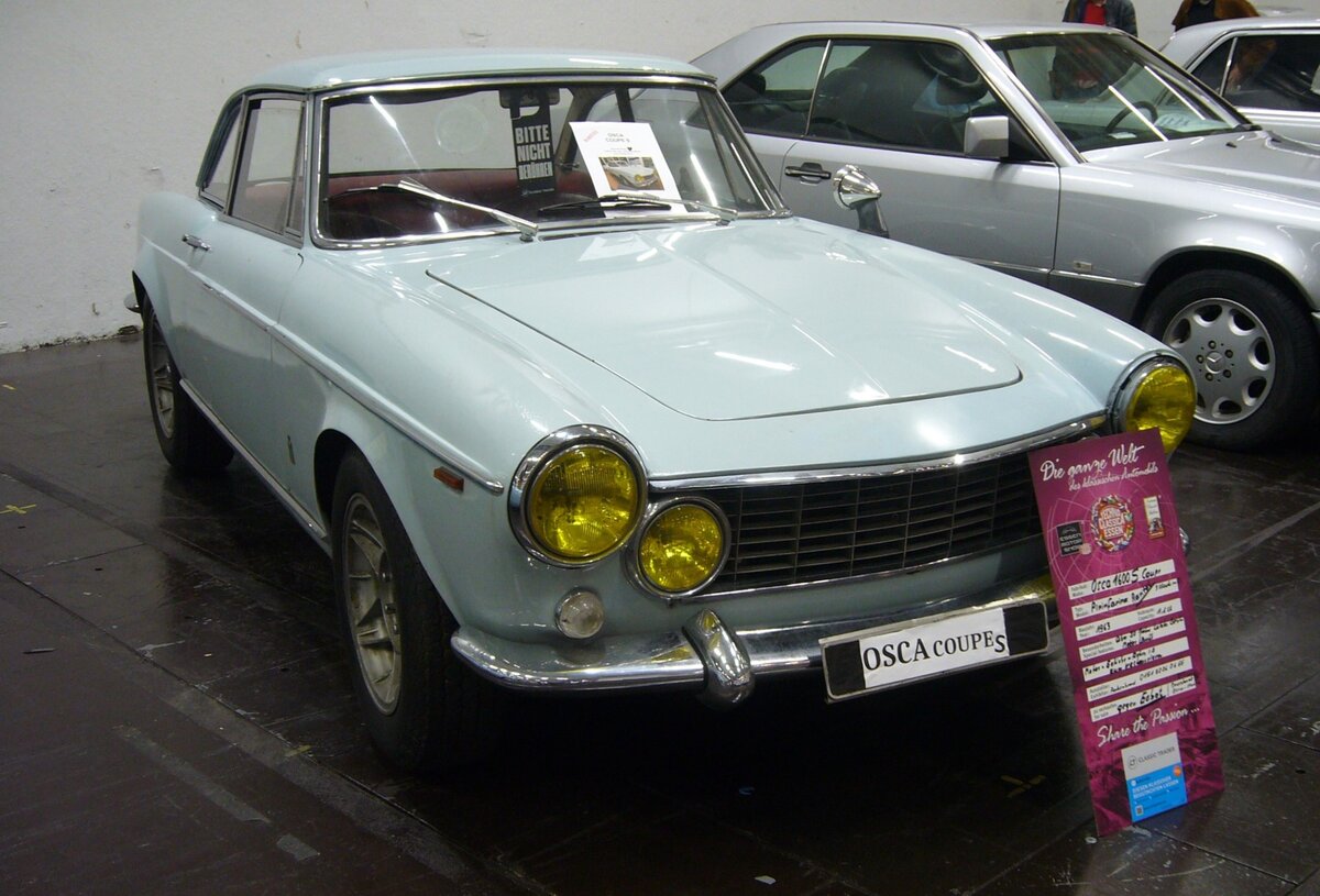 O.S.C.A. 1600S Coupe. Der O.S.C.A. 1600S ist eine Zusammenarbeit zwischen drei großen Namen der Automobilgeschichte. In den späten 1950`er Jahren suchen die Maserati-Brüder und ihre Firma O.S.C.A. (O fficine S pezializzata C ostruzioni A utomobili) nach Möglichkeiten, ihre Rennsportmotoren in Serienautos einzubauen. Mit Rennsport allein lässt sich schließlich nicht genug Geld verdienen. 1957 führt Ernesto Maserati ein Gespräch mit Fiat´s legendären Dante Giacosa. Er erklärt die Idee, einen leichten Vierzylindermotor zu bauen und Giacosa ist gleich begeistert. Fiat hatte das Problem mit den zu langsamen 1100´er und 1200`er Motoren. Man entschied sich für einen Nachfolger mit den O.S.C.A.-Motoren und Pinin Farina konnte dann eine Karosserie zeichnen und bauen. Zunächst mit einem 75 PS starken 1500´er Motor. Dieser wurde im Oktober 1962 durch einen schnelleren 1600´er mit satten 90 PS abgelöst. Zu dieser Zeit eine enorme Leistung. Der 1600S war teuer und die Produktionszahlen begrenzt. Es wurden 814 Autos dieses Typs hergestellt. Der Vierzylinderreihenmotor dieses Autos aus dem Jahr 1963 hat einen Hubraum von 1568 cm³ und leistet 90 PS. Techno Classica Essen am 06.04.2024.