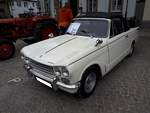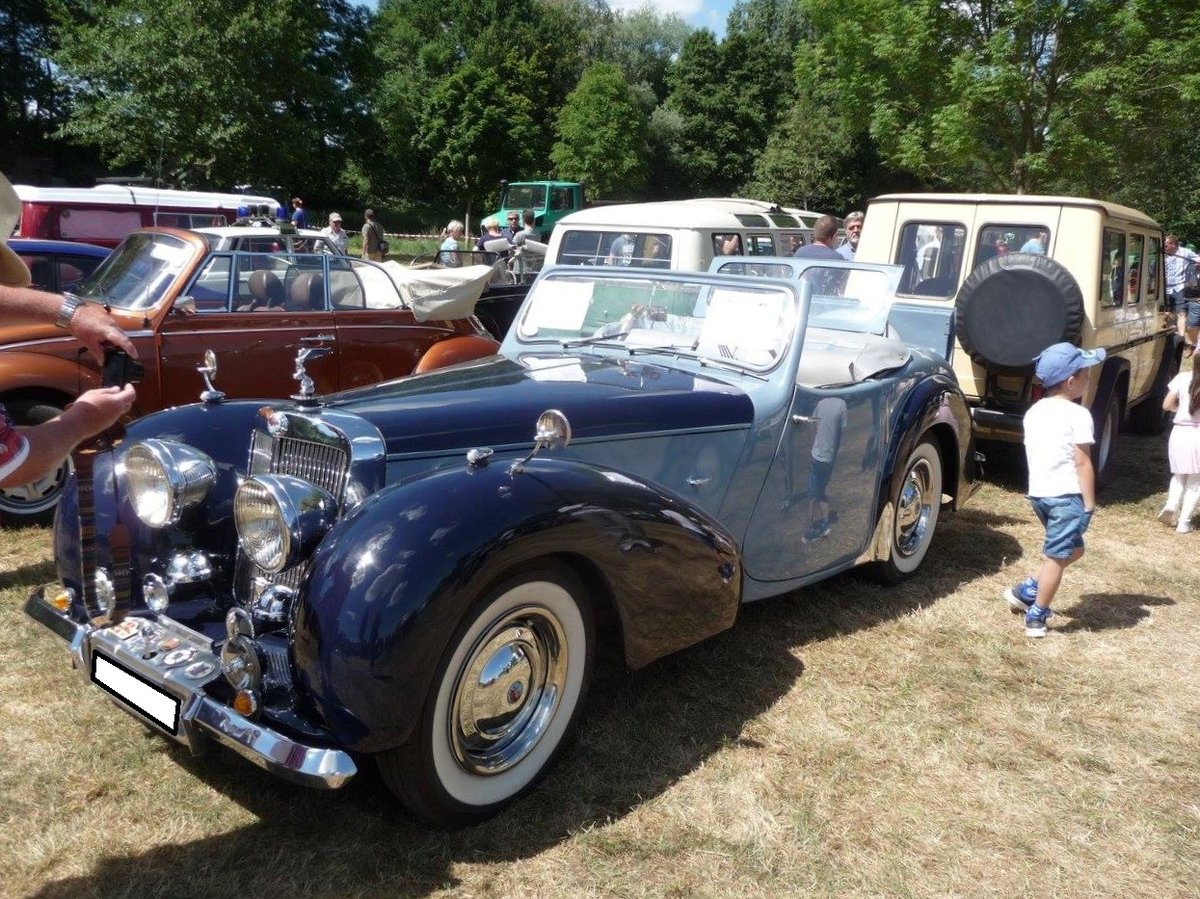 Triumph 1800 Roadster, gebaut in den Jahren von 1946 bis 1948. Mit diesem Roadster-Modell nahm die Firma aus Coventry im Jahr 1946 wieder den Bau von Autos auf. Das Modell war schon zu Beginn von WW2 konstruiert worden. Eine pfiffige Lösung war die Konstruktion der aufklappbaren Windschutzscheiben für die Passagiere auf den hinteren beiden Notsitzen. Das Fahrzeug war schwer und unhandlich und verkaufte sich lediglich 4500 mal. Der Vierzylinderreihenmotor hat einen Hubraum von 1776 cm³ und leistet 50 PS. Mittels eines Vierganggetriebes, teilweise mit Overdrive, erreichte der 1800 Roadster immerhin eine Höchstgeschwindigkeit von 130 km/h. Oldtimertreffen in Melderslo/NL zu Pfingsten 2017.