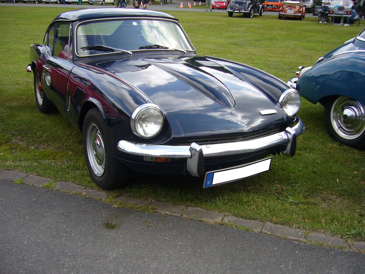 Triumph GT6 MK2, gebaut von 1968 bis 1970. Das auf Basis des preisgünstigen Sportwagens Spitfire konstruierte Coupe GT6 wurde bereits 1966 als MK1 vorgestellt. Allerdings war im Coupe anstatt eines 1.3l Motors ein Vierzylinderreihenmotor mit einem Hubraum von 1998 cm³ verbaut. Dieser leistet 105 PS. In England wurde dieses Modell spöttisch "Arme-Leute E-Type" genannt. Oldtimertreffen an der Dreieckswiese in Duisburg am 01.08.2021.