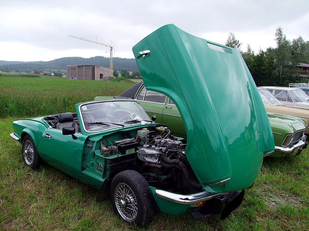 Triumph Spitfire MK IV, der Modelljahre von 1970 bis 1974. Der Spitfire wurde bereits 1962 vorgestellt. Im Laufe der langen Produktionszeit änderte sich am Spitfire einiges. Der Mk IV hat einen Vierzylinderreihenmotor, der aus einem Hubraum von 1296 cm³ 60 PS leistet. Der abgelichtete Spitfire MK4 im Farbton signal red wurde 1972 erstmals zum Straßenverkehr zugelassen. Classic car meeting in Brynmawr/South Wales am 27.07.2025. Michael H.