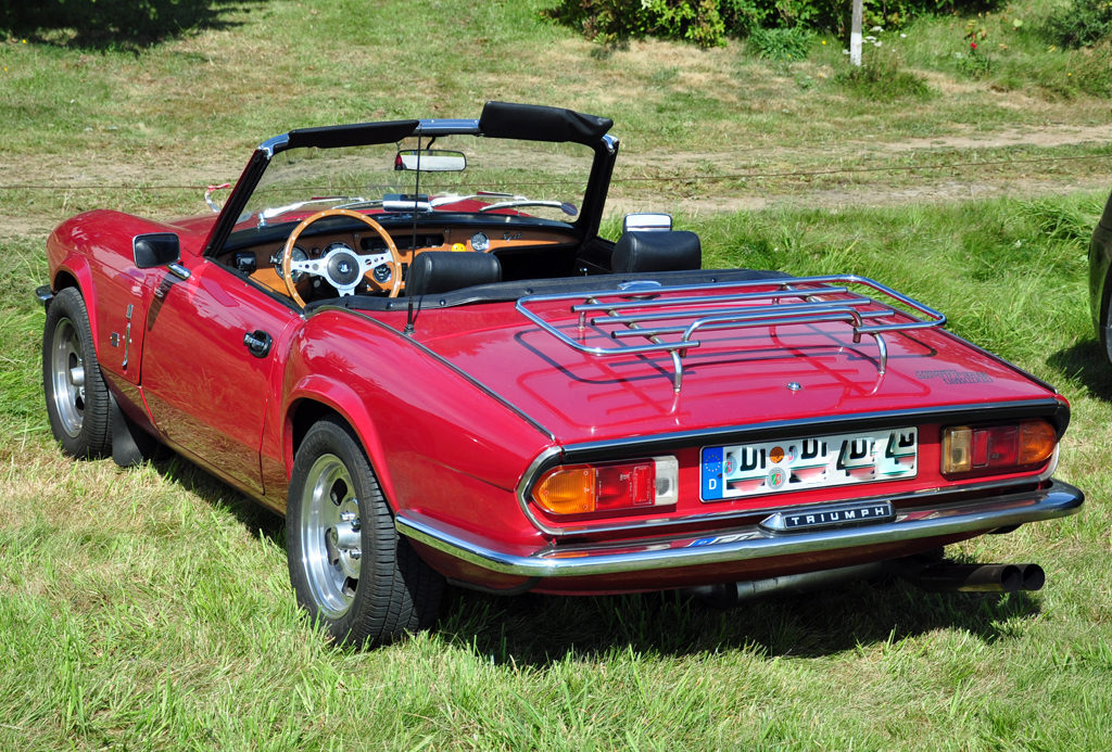 Triumph Spitfire MK IV, der Modelljahre von 1970 bis 1974. Der Spitfire wurde bereits 1962 vorgestellt. Im Laufe der langen Produktionszeit änderte sich am Spitfire einiges. Der Mk IV hat einen Vierzylinderreihenmotor, der aus einem Hubraum von 1296 cm³ 60 PS leistet. Der abgelichtete Spitfire MK4 im Farbton signal red wurde 1972 erstmals zum Straßenverkehr zugelassen. Classic car meeting in Brynmawr/South Wales am 27.07.2025. Michael H.
