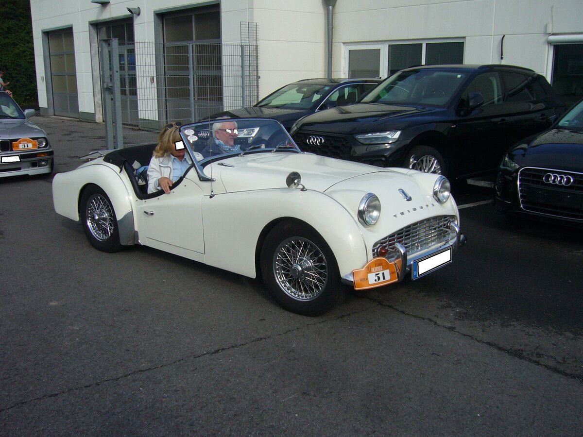 Triumph TR3 im Farbton pearl white, gebaut von 1955 bis 1957. Die TR3 Roadster aus Coventry waren ein Verkaufsschlager. Der Vierzylinderreihenmotor leistet 95 PS aus einem Hubraum von 1991 cm³. Im Jahr 1957 erschien der Facegeliftete TR3A der noch bis 1962 mit der gleichen Motorisierung weiter gebaut wurde. Start zum 8. Saarner Oldtimer Cup am 22.08.2021.
