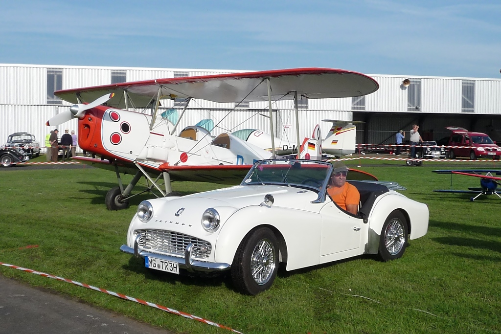 Triumph TR3 präsentiert sich für die Fotografen vor einer Stampe SV-4C auf dem Flugplatz Niershorst (Grefrath, 11.9.2010)