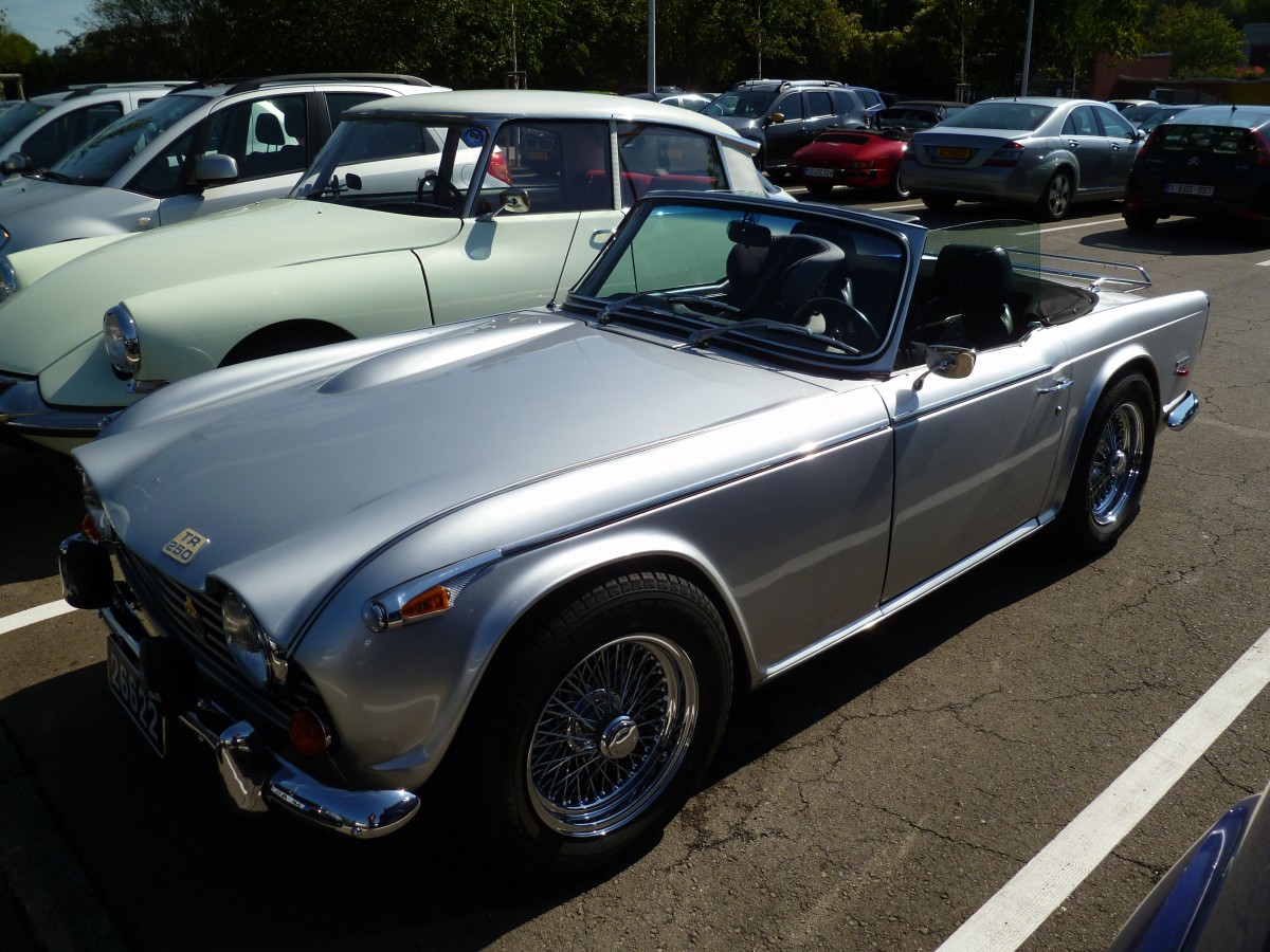 Triumph TR250 im Farbton jasmine aus dem Jahr 1968. Gebaut wurde das Modell in den Jahren 1968 und 1969. Im Grunde ist der Triumph TR250 ein TR5, der durch Umrüstung auf zwei Vergaser auf die Abgasbestimmungen in den USA, dem wichtigsten Exportland für die Marke Triumph, eingestellt wurde. Der Sechszylinderreihenmotor hat einen Hubraum von 2498 cm³ und leistet zwischen 103 PS und 105 PS. Die Höchstgeschwindigkeit gab man bei Triumph mit 172 km/h an. Insgesamt wurden in den zwei Produktionsjahren knapp 8.500 Fahrzeuge dieses Typs gebaut. 10. Oldtimertreffen des AMC Duisburg am 25.08.2024 am LaPaDu Duisburg. Michael H.