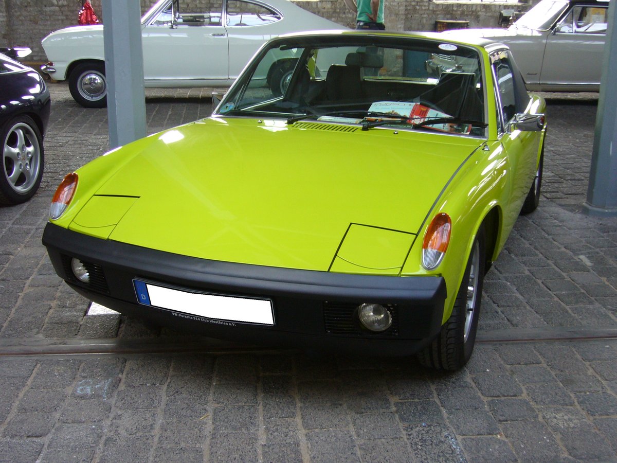 VW-Porsche 914.4 2.0, gebaut von 1972 bis 1975. Der "Volksporsche" wurde bereits 1969 vorgestellt. Der Mittelmotor "Targa" war während seiner siebenjährigen Produktionszeit mit etlichen Motorisierungen lieferbar. Hier wurde eine 914.4 mit der stärksten Motorisierung aus den letzten Baujahren abgelichtet. Der Vierzylinderboxermotor leistet 100 PS aus einem Hubraum von 1971 cm³. Die Höchstgeschwindigkeit liegt bei 192 km/h. Oldtimertreffen an der "Alten Dreherei" in Mülheim an der Ruhr am 15.06.2019.