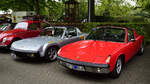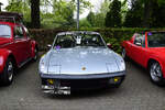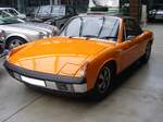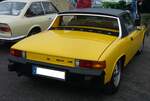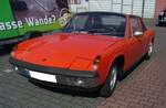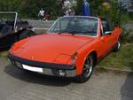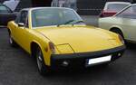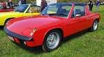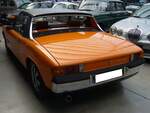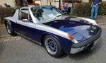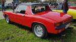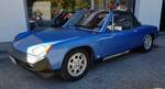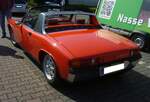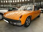 VW-Porsche 914.4 2.0, gebaut von 1973 bis 1976. Der so genannte "Volksporsche" wurde bereits im Jahr 1969 vorgestellt. Der Mittelmotor Targa war während seiner siebenjährigen Produktionszeit mit etlichen Motorisierungen lieferbar. Hier wurde ein 914.4 2.0 abgelichtet. Der Wagen ist im Farbton olympiablau lackiert. Als Antrieb dient diesem Fahrzeug ein Vierzylinderboxermotor mit einem Hubraum von 1971 cm³ und einer Leistung von 101 PS Die Höchstgeschwindigkeit liegt bei 190 km/h. Classic Remise Düsseldorf am 27.08.2024.