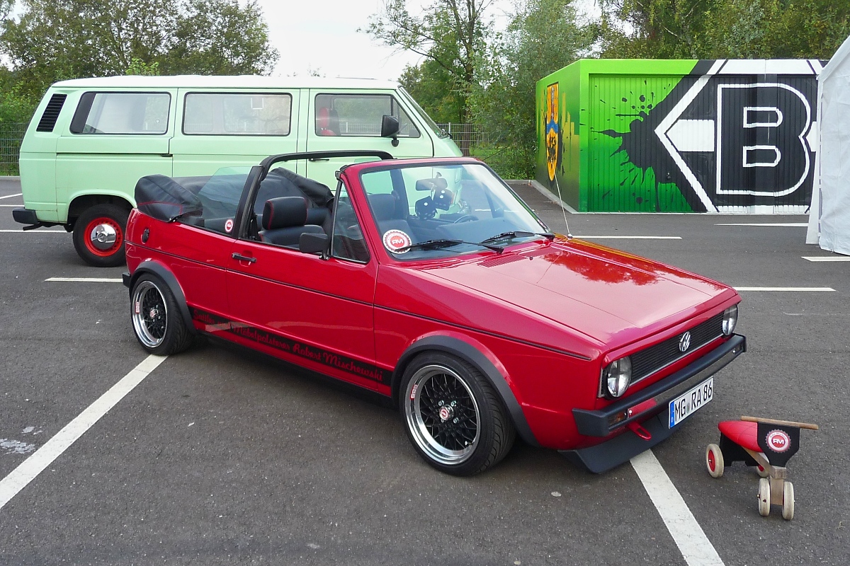 Ein VW Golf I Cabrio und farblich passend dazu das Nachwuchsfahrzeug auf der Automesse MG, 7.9.14