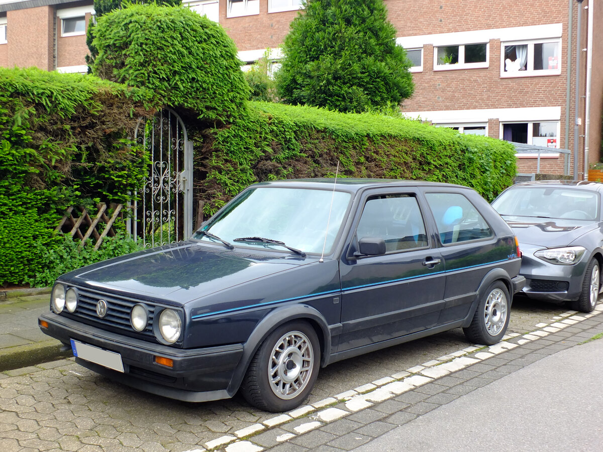 VW Golf 2 GTI 16V. Während der "normale" VW Golf 2 bereits im Jahr 1983 bei den Händlern stand, kam das sportliche GTI-Modell erst Anfang 1984 ins Modellprogramm von VW. Der hier gezeigt, dreitürige, GTI ist mit dem ab Frühjahr 1987 lieferbaren Vierzylinderreihenmotor mit 16-Ventiltechnik ausgerüstet. Dieser Motor mit Katalysatortechnik hat einen Hubraum von 1781 cm³ mit einer Leistung von 129 PS. Die Höchstgeschwindigkeit gab das VW-Werk damals mit genau 200 km/h an. Classic car meeting in Brynmawr/South Wales am 27.07.2025. Michael H.