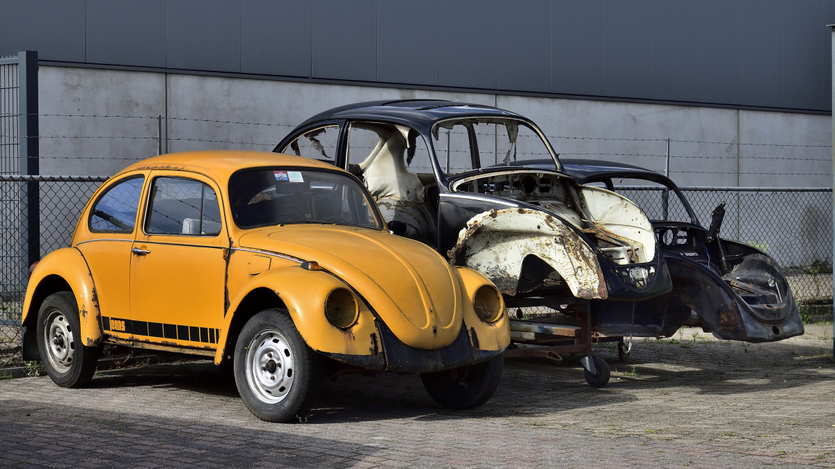 Profilansicht eines chinchillagrauen, rechts gelenkten, VW Typ 1 "Käfer aus dem Jahr 1968. September 2024 auf dem Besucherparkplatz eines Pubs in Pont-Neddfechan/South Wales.