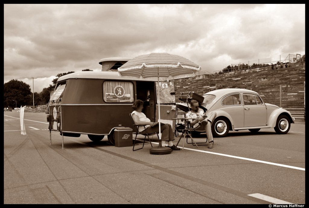 Fast wie in alten Zeiten... Dieser Wohnanhänger und VW-Käfer standen am 8. Juli 2012 beim Käfertreffen an der Steintribüne in Nürnberg. Das Bild wurde von mir etwas "gealtert". Eindrucksvoll waren die ganzen vielen kleinen Details, zum Beispiel: der kleine Radio auf dem Tisch oder die Geschirrtücher die hinten zum Trocknen aufgehängt sind.