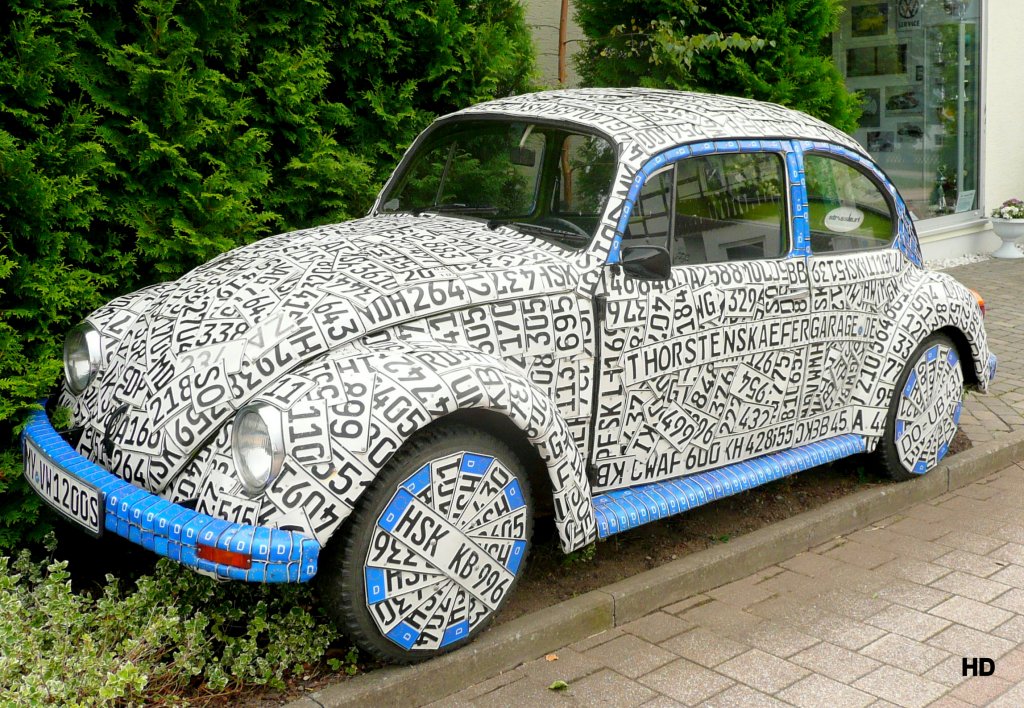 Ein mit vielen alten Nummernschildern verzierter VW-Käfer.