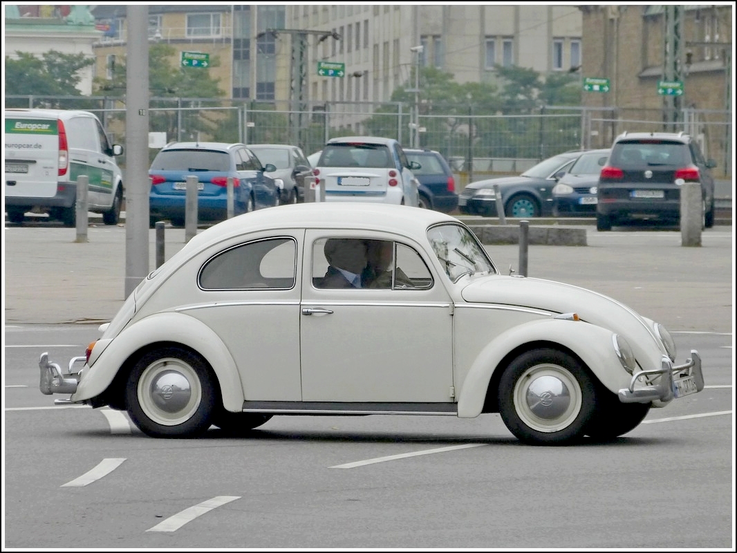 Seitnansicht eines VW Käfer, welcher in flottem Tempo unterwegs ist. 22.09.2013.