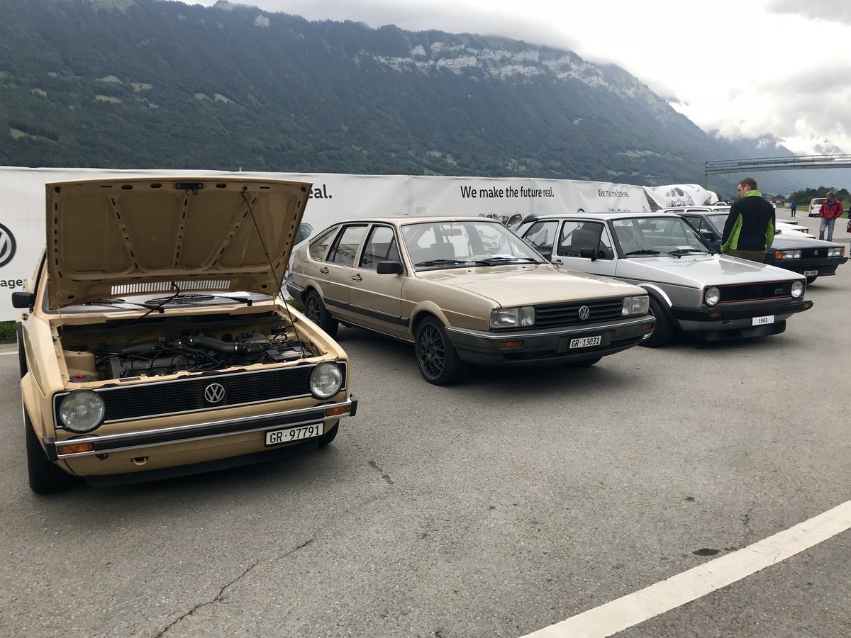 2 VW Golf 1 und ein Scirroco beim 70 Jahre VW Volksfest am 25.8.18 in Interlaken.