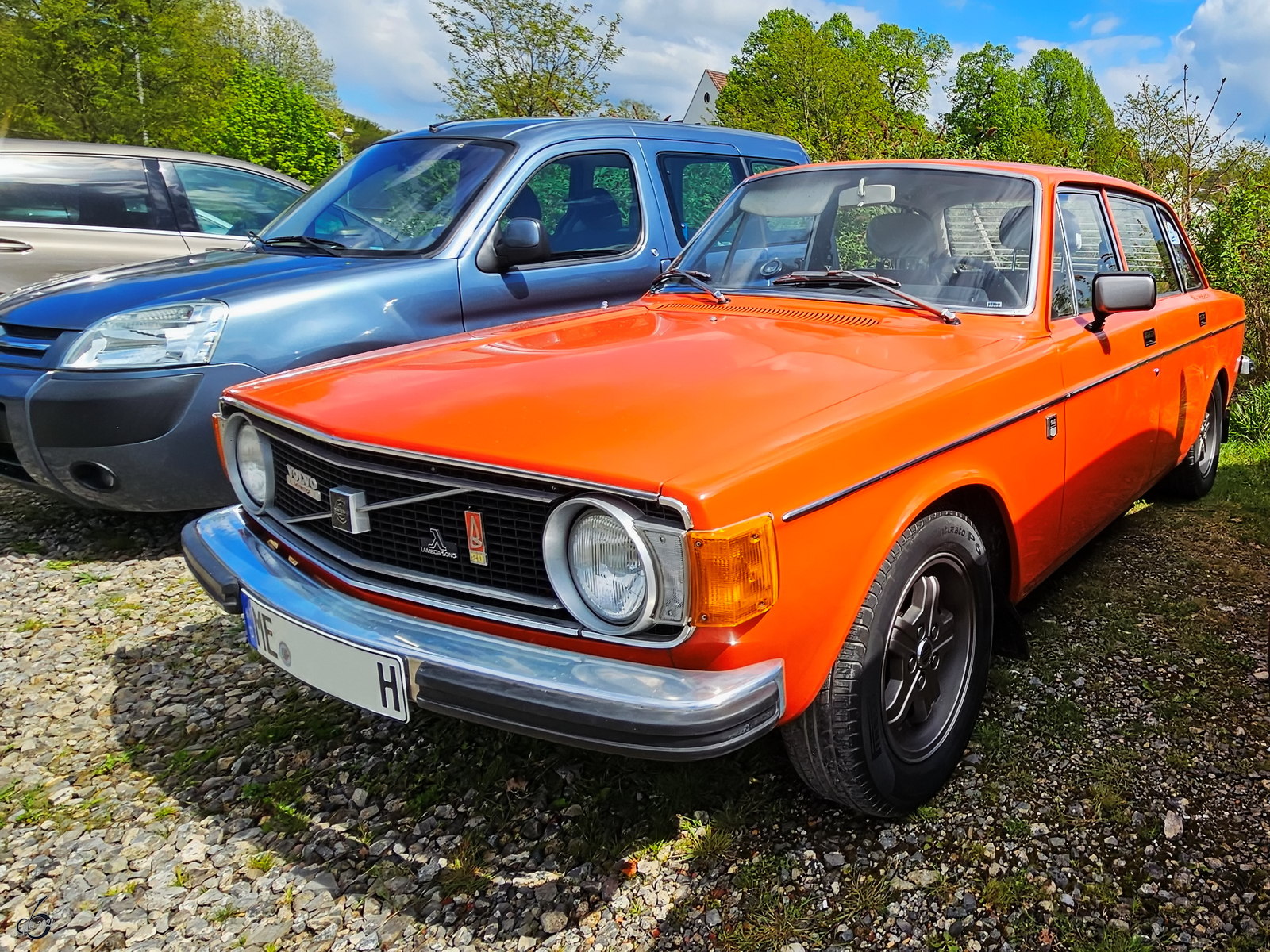 Im perfecktem Lack präsentiert sich dieser Volvo 144, so entdeckt Mitte April 2024 in Bochum-Dahlhausen.