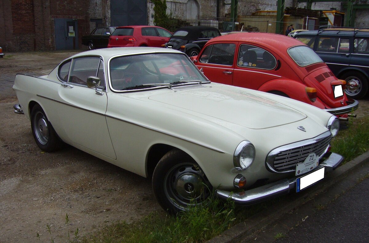 Volvo P 1800 S im Farbton körsbärsröd, gebaut von 1963 bis 1972. Das von  Frua  gezeichnete Coupe stand bereits ab 1961 bei den Volvo-Händlern. Anfangs wurde der Wagen bei Jensen in West Bromwich/GB montiert. Aufgrund von Qualitätsmängeln, wurde die Produktion im Jahr 1963 ins Volvo-Stammwerk Lundby bei Göteborg verlegt. Die hier produzierten Fahrzeuge sind am Buchstaben S (für Schweden bzw Sverige) in der Typenbezeichnung erkennbar. Von 1961 bis 1968 hatte der P1800 einen Vierzylinderreihenmotor mit einem Hubraum von 1778 cm³ und einer Leistung von 103 PS. Nach den Werksferien des Jahres 1968 wurde der sogenannte B2-Motor mit einem Hubraum von 1985 cm³ und einer Leistung von 124 PS verbaut. Da der gezeigte P1800S ein solches Modell ist dürfte er ab Sommer 1968 gebaut worden sein. Oldtimertreffen auf dem Gelände des Bikertreffs Mutter Vogel in Marl am 28.09.2025.