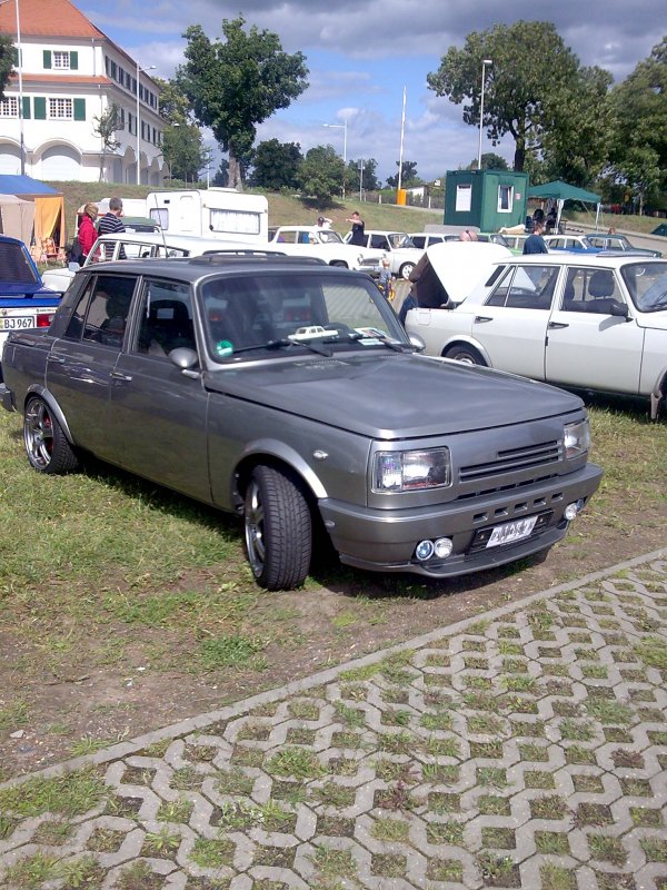Wartburg 1.3 Limousine. Ab Oktober 1988 wurde in der modernisierten Karosserie des Wartburg 353, ein Vierzylinderreihenmotor (Lizenz Volkswagen) verbaut. Der Motor wurde in der DDR montiert und war ursprünglich für den VW Polo der zweiten Serie konstruiert worden. Er hat einen Hubraum von 1272 cm³ und leistete anfänglich 58 PS. Ab dem Sommer 1990 stieg die Motorleistung auf 64 PS. Der Wartburg 1.3 war als viertürige Limousine, fünftüriges Kombimodell namens "Tourist" und als Pickup mit der Bezeichnung "Trans" lieferbar. Oldtimertreffen am Theater an der Niebu(h)rg am 19.10.2025 in Oberhausen/Rheinland. Michael H.