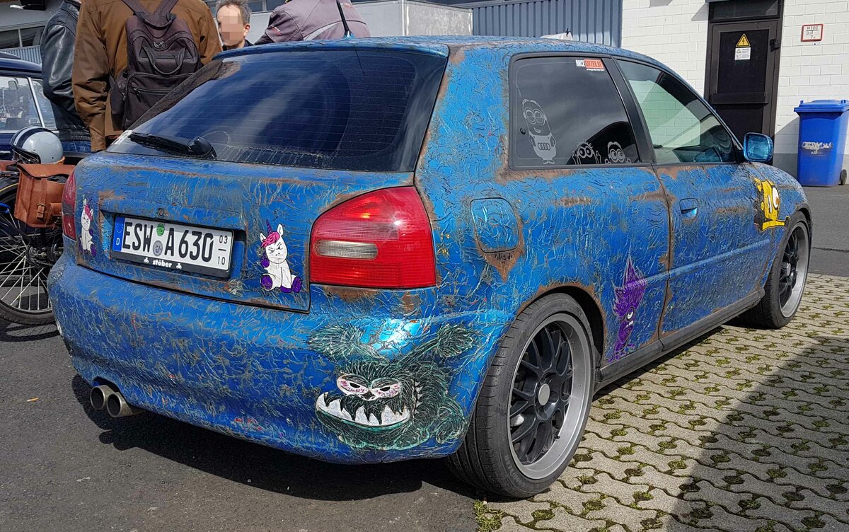 =Audi A 3 in auffälligem Kleid, steht auf dem Freigelände der Technorama 2023 in Kassel