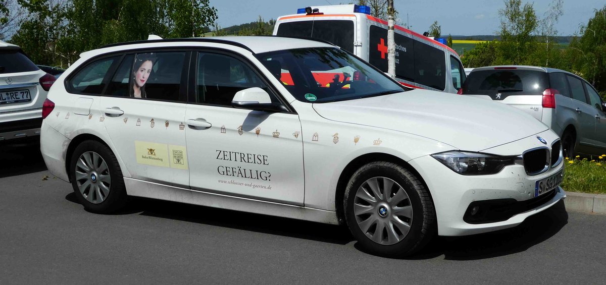 =BMW der STAATLICHEN SCHLÖSSER UND GÄRTEN BADEN-WÜRTTEMBERG steht auf dem Parkplatz der RettMobil 2017 in Fulda, Mai 2017