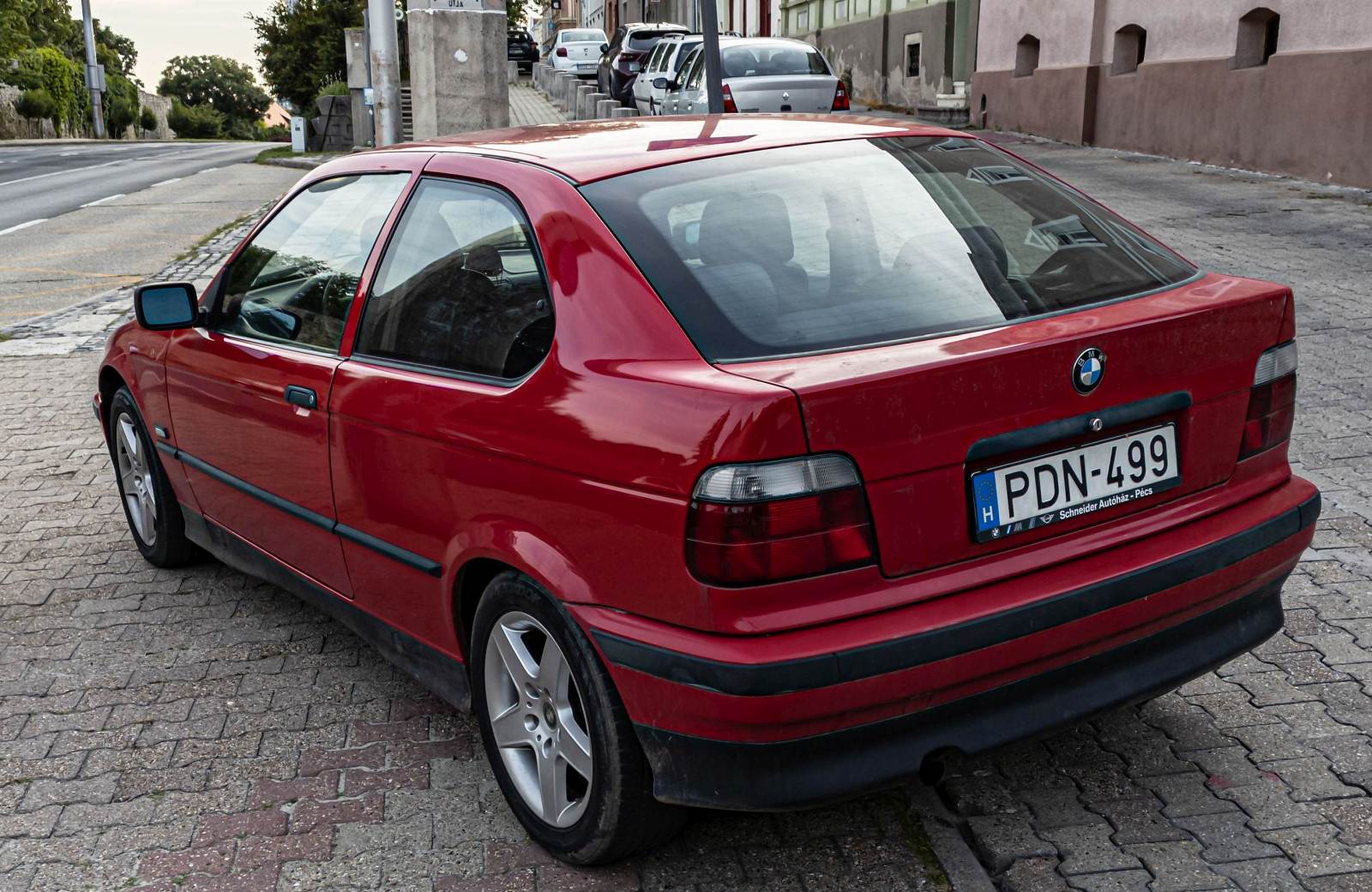 BMW 3er (E36) Compact in Imolarot (Imola Red auch genannt). Foto: 06.2022.