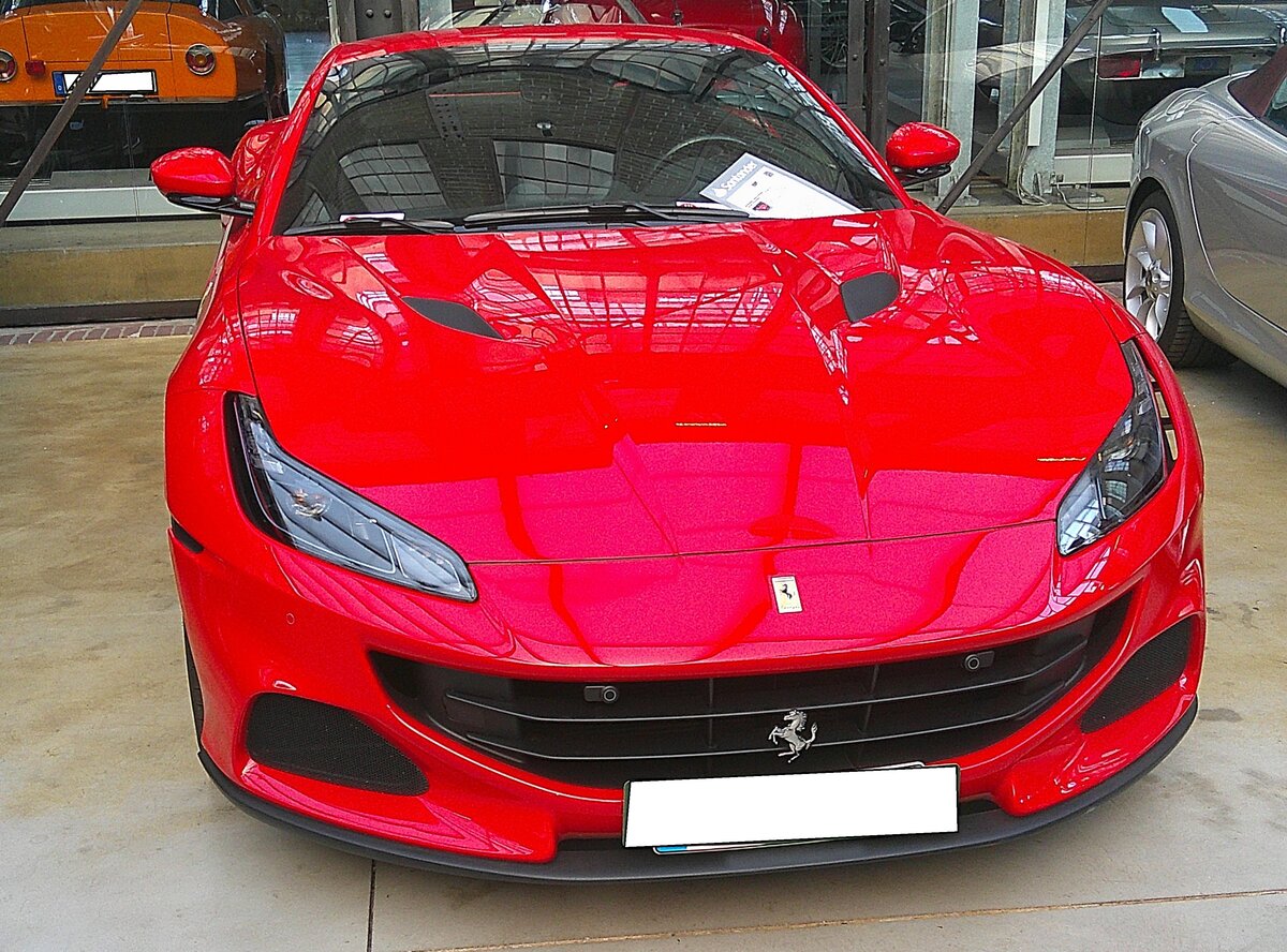 Ferrari Portofino M im Farbton rosso corse aus dem Jahr 2022. Mit dem Bezug zu einer der schönsten Städte Italiens, brachte Ferrari im Jahr 2018 ein besonders vielseitiges Cabrio auf den Markt.  Portofino  ist allseits beliebt wegen seines charmanten kleinen Hafens und über die Jahre zu einem internationalen Synonym für Eleganz, Sportlichkeit und dezenten Luxus geworden. Der gezeigte Portofino M wurde von September 2020 bis zur Einstellung der Modellreihe im März 2023 produziert. Angetrieben wird der Sportwagen durch einen V8-Motor mit einem Hubraum von 3855 cm³ und einer Leistung von 620 PS. Mit dieser Motorleistung beschleunigt der Bolide von 0 km/h auf 200 km/h in 9.8 Sekunden. Die Höchstgeschwindigkeit soll 320 km/h betragen. Classic Remise Düsseldorf am 03.10.2025.