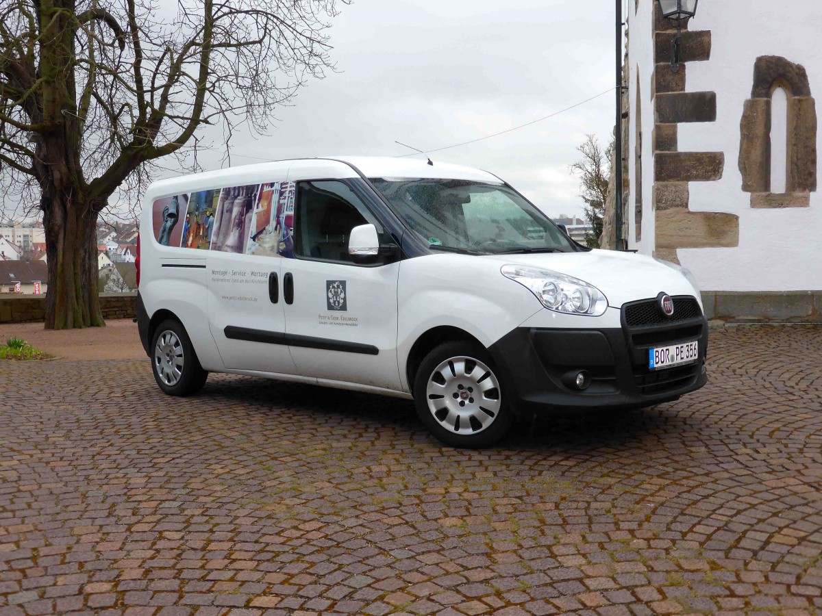 Fiat Doblo der Firma "Petit & Edelbrock" steht vor der Pfarrkirche St. Jakobus in 36088 Hünfeld, März 2015