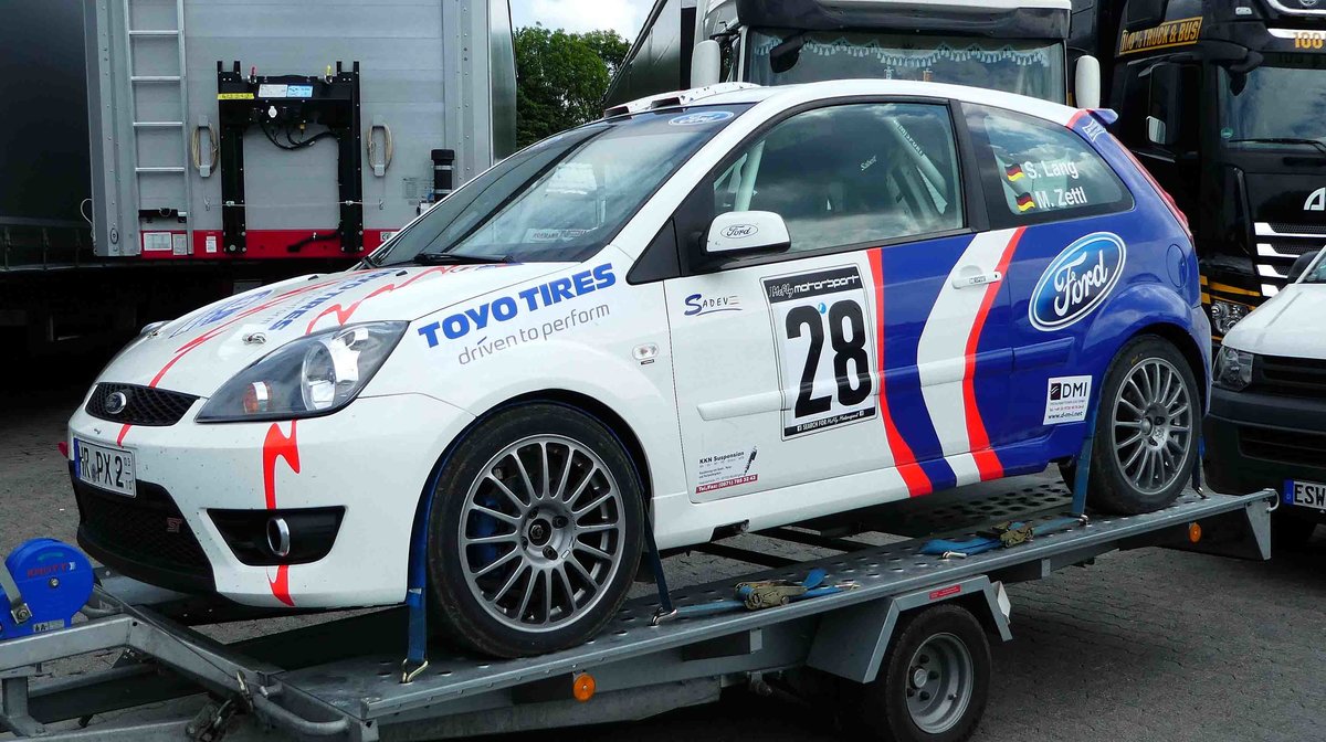 =Ford Fiesta ST, Teilnehmerfahrzeug der Rallye Fränkisches Weinland 2018, gesehen auf dem Rasthof Fulda Nord im Mai 2018