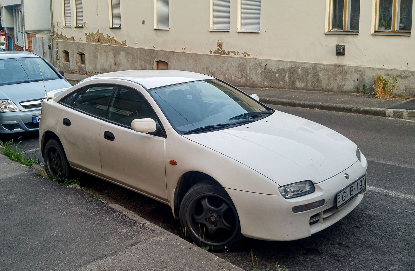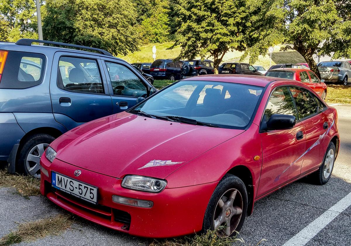 Mazda 323. Aufnahme: Pécs (Ungarn), August, 2019.