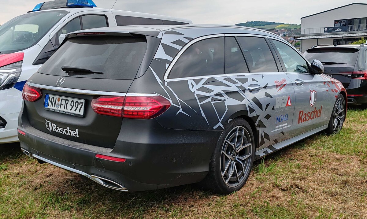 =MB E-Klasse der Firma RASCHEL, gesehen auf dem Parkplatzgelände der RettMobil 2024 in Fulda