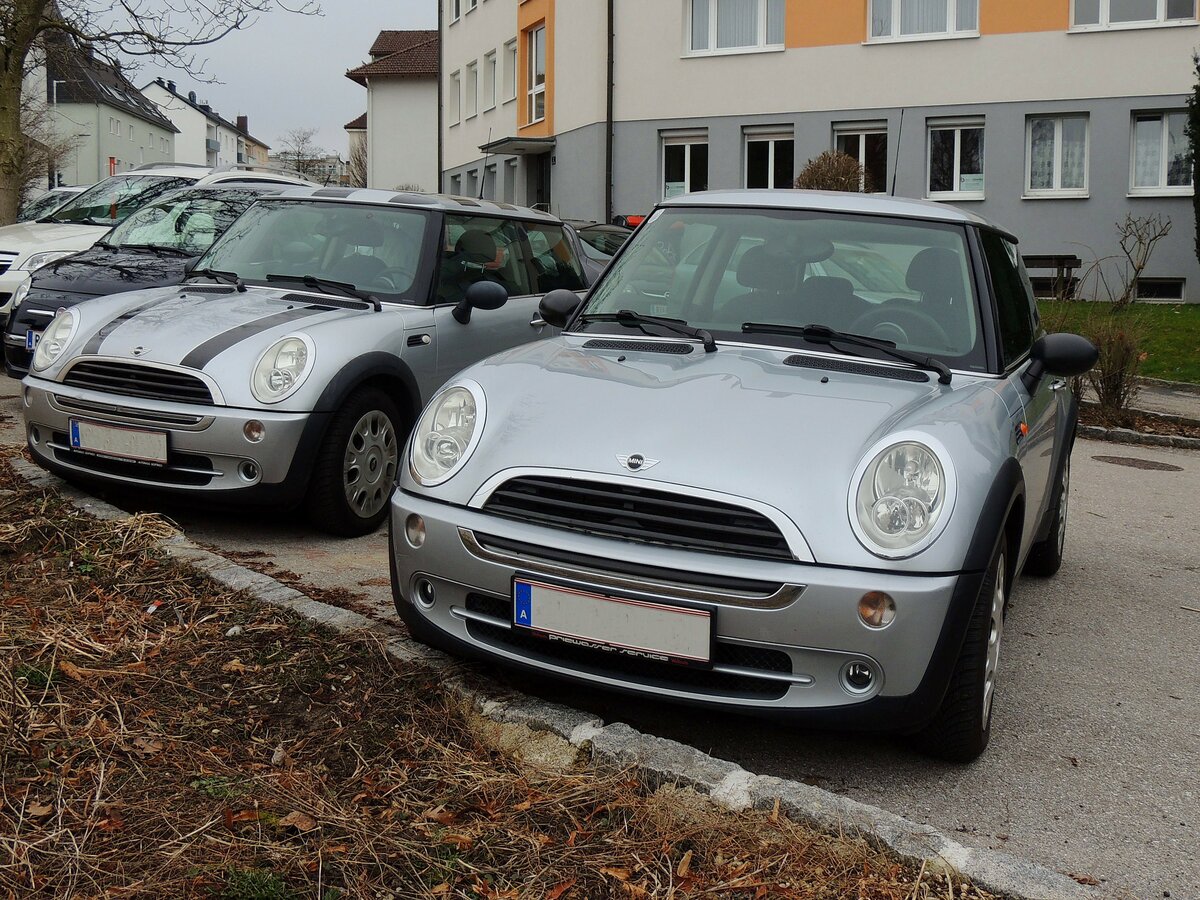 MINI, sozusagen im Doppelpack, auf einem abschüssigen Parkplatz; 240227