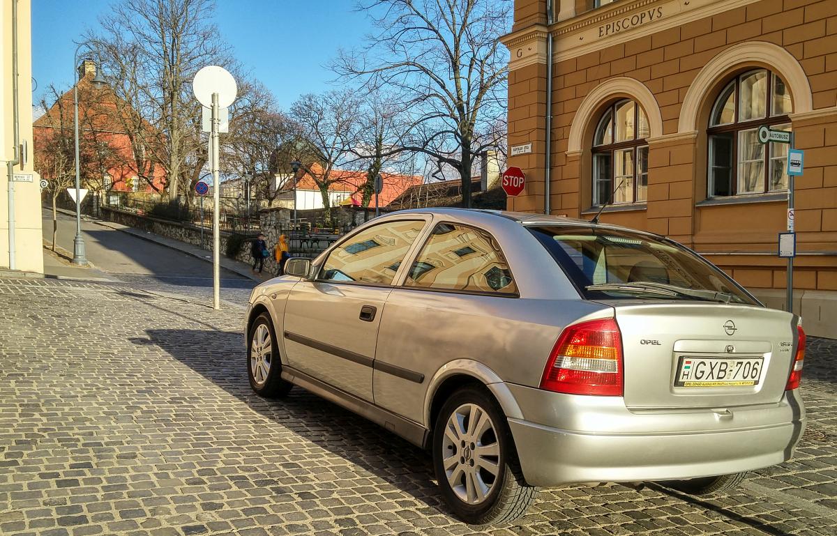 Rückansicht: Opel Astra G beim niedrigeren Sonnenstand in Februar 2020