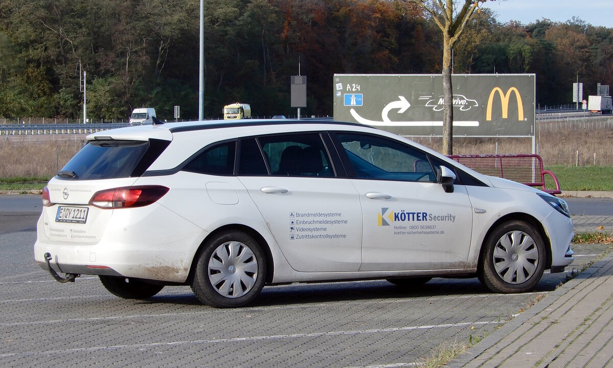 Dienstfahrzeug der Firma Kötter, ein Opel Astra Caravan, am 07.11.23 auf der BAB 24.