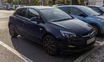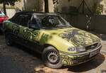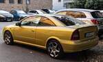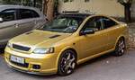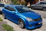 Blauer Opel Astra F Schrägheck. Die Stahlfelgen haben etwas Alufelgen-look. In Ungarn gab es viele solche Astras bei der Polizei, die Exemplaren hatten solchen Felgen oft. Foto: April, 2025.