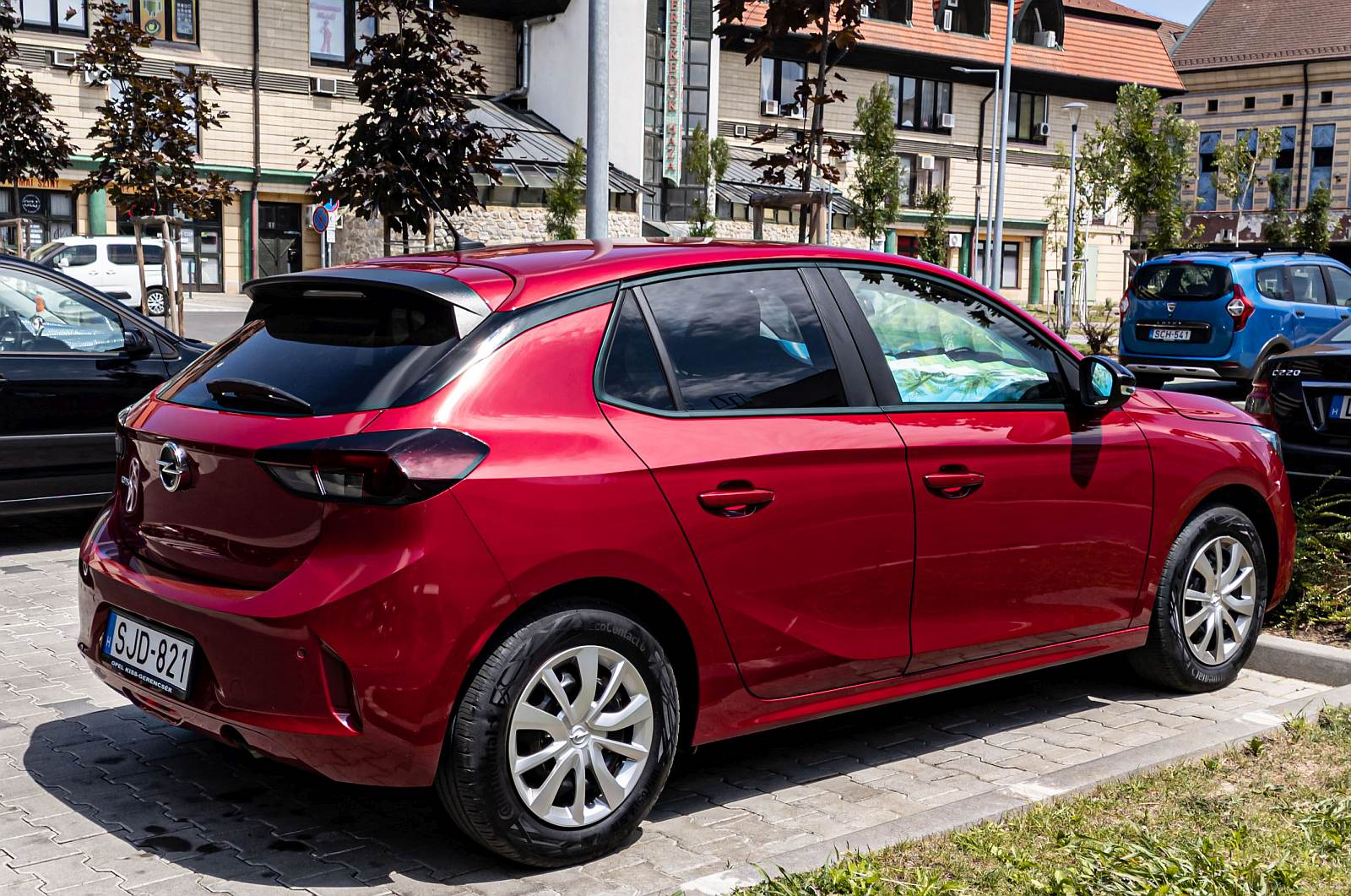 Rückansicht / Seitenansicht: Opel Corsa F in Kardiorot. Foto: Juli, 2022