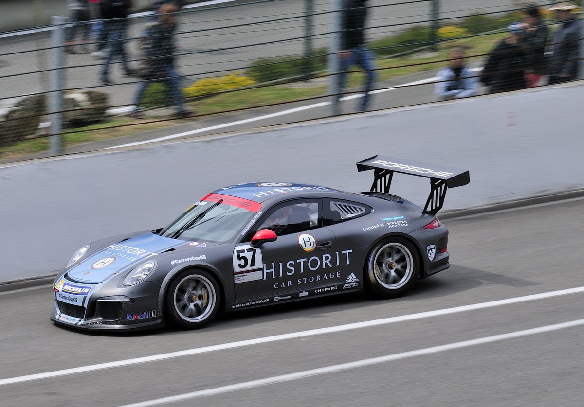 Porsche 911 GT3 Cup (Type 991), beim Rennen des Porsche Carrera Cup Great Britain, in Spa Francorchamps am 2 Mai 2015.