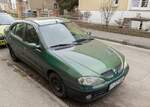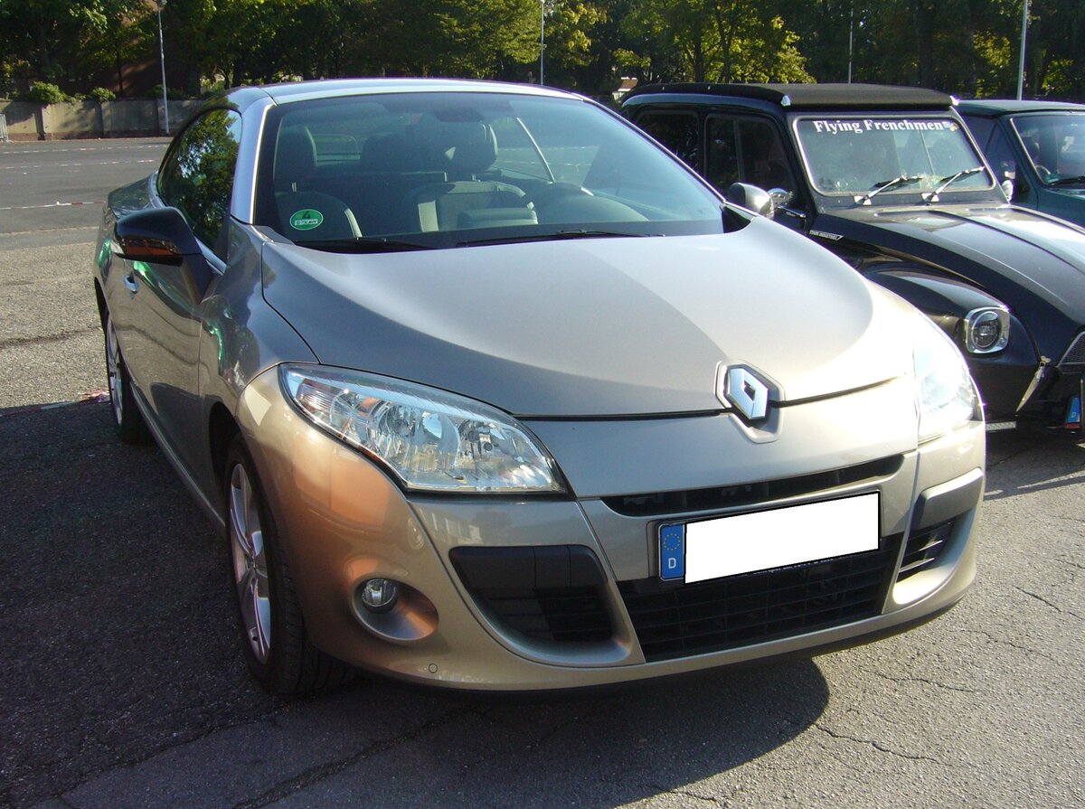 Renault Megane III CC aus dem Jahr 2011. Im Jahr 1995 löst die Modellreihe Megane die Mittelklassebaureihe Renault R19 ab. Der Megane bildet eine Modellfamilie aus fünftüriger Limousine, viertüriger Stufenhecklimousine und dem Minivan Scenic. Ab dem Jahr 1997 vervollständigte das viersitzige Cabriolet Megane CC die Modellpalette. Die dritte Generation des Megane (interne Typenbezeichnung X95) feierte ihre Premiere 2008 und ab Juni 2010 komplettierte das gezeigte Coupé-Cabriolet die Modellpalette. Der Viersitzer verfügt über ein elektrisch betätigtes, stabiles Dach aus Blech und Glas. Der hier gezeigte Megane CC hat einen Vierzylinderreihenmotor mit einem Hubraum von 1997 cm³ und einer Leistung von 140 PS. Die Höchstgeschwindigkeit beträgt 195 km/h. French Car Devotion am 03.10.2024 an Mo´s Bikertreff in Krefeld.